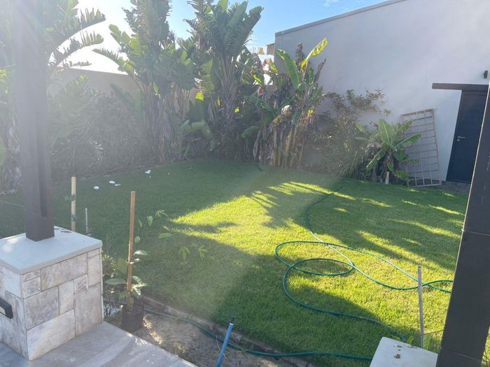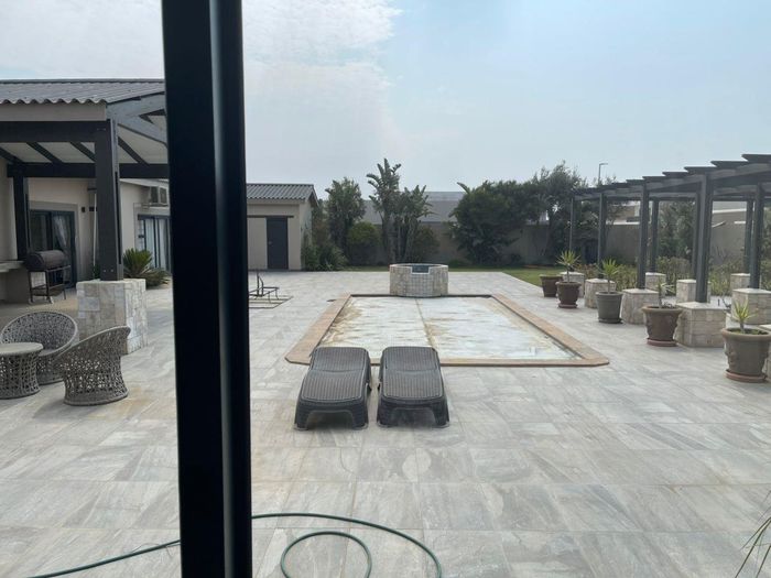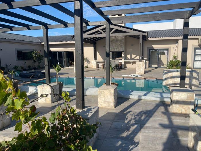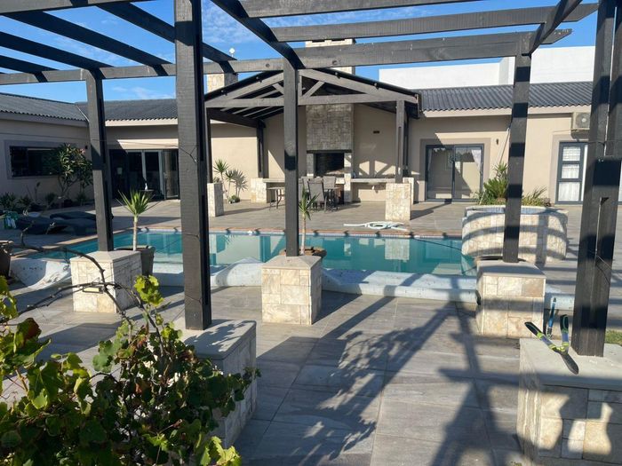 Coastal holiday sanctuary in Meersig, Walvis Bay, perfect for entertaining with a pool and water feature, expansive patio and built-in braai; three bedrooms, two bathrooms, three-car garage.